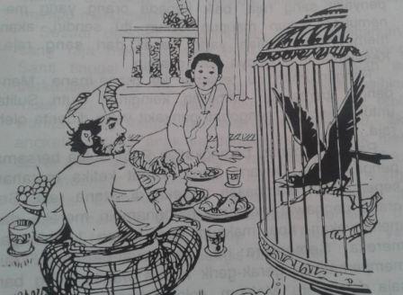 Ketika mereka bersantap, tiba-tiba berbunyilah gagak buta dari dalam sangkarnya. "Makanlah yang enak Tuan, biarlah aku dalam sangkar kelaparan!