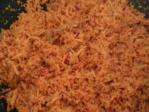 Pertama sangrai bawang merah sampe layu kemudian masukkan teri sangrai sampe harum kemudian masukkan bumbu halus aduk rata dan masukkan parutan kelapa aduk sampai semua bumbu tercampur rata dan matang menggunakan api kecil kemudian tes rasa,jika sudah dirasa pas masukkan perasan jeruk aduk rata lagi kemudian sisihkan