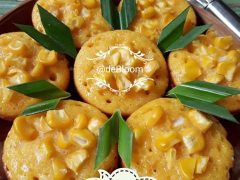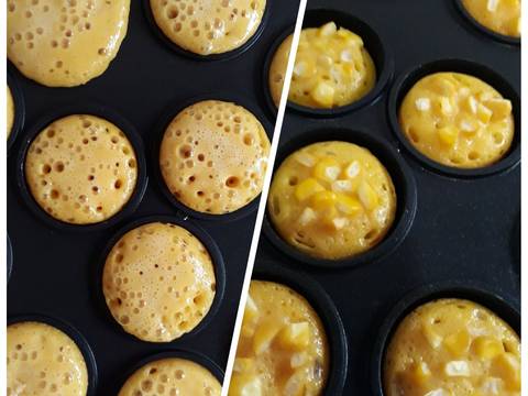 Tuang adonan kedalam loyang hingga 3/4 penuh. Panggang dengan suhu 170 dercel sampai setengah matang, taburi jagung dan panggang lagi sampai matang. Angkat.