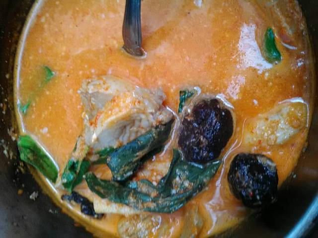 4. Setelah mendidih masukkan ikan, kentang, daun jeruk, daun ruku-ruku, daun kunyit, asam kandis, garam. rebus dengan api kecil hingga ikan dan kentang empuk.