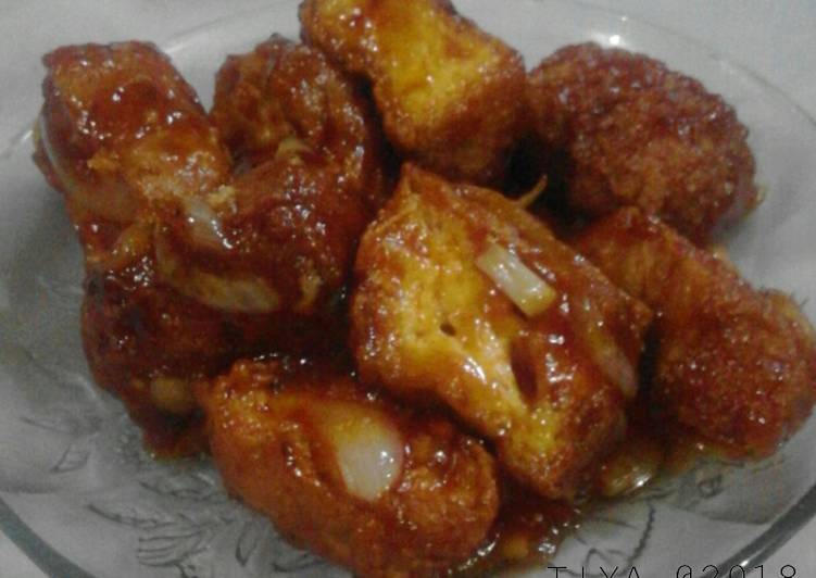 Iris bawang bombay, cincang bawang putih. Tumis dgn sedikit minyak hingga harum. Tambahkan saos tiram, saos tomat dan saos kecap. Tambahkan air. Biarkan mendidih, tambahkan tahu. Aduk rata. Matikan kompor.