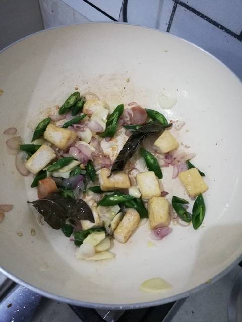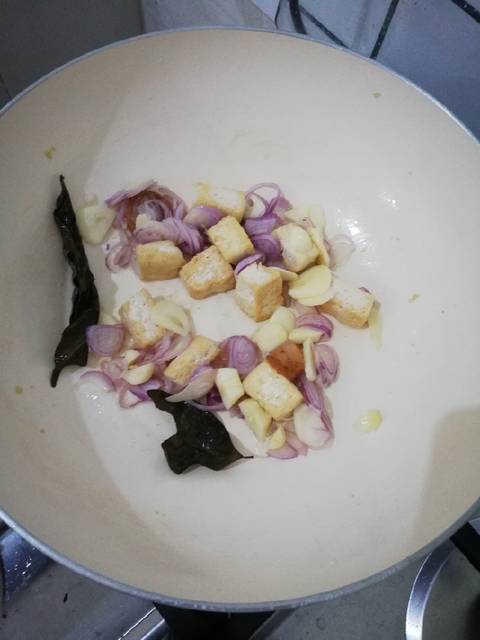 Goreng tahu hingga berkulit. Masukkan daun salam dan lengkuas. Masukkan bawang merah dan bawang putih. Tumis hingga harum.