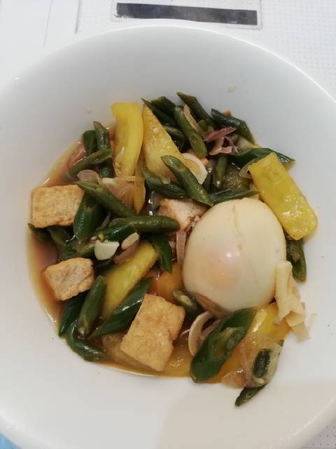 Siapkan bahan. Rebus dahulu telor dan kacang panjang. Kacang panjang, bawang merah, bawang putih, cabe diiris serong. Belimbing wuluh potong 3.