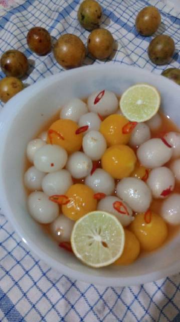 Masukkan hasil ulekan cabe ke dalam rambutan dan gandaria beri air aduk2, siramkan perasan jeruk nipis (kalau besar separuh saja)