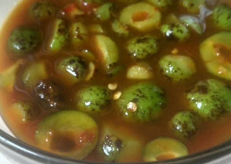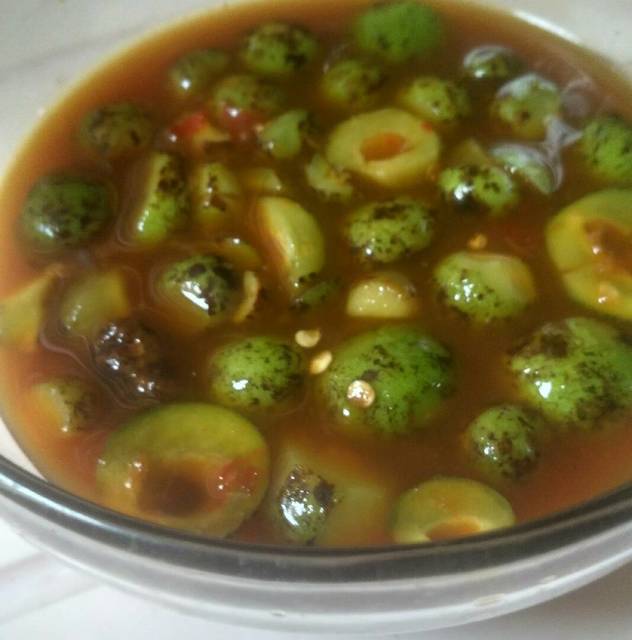 Ulek/haluskan cabe (sesuai selera), garam, terasi, gula merah, kemudian masukan gandaria tekan2 sedikit