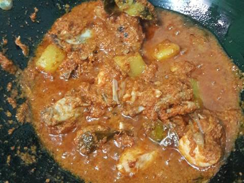 Jika sudah kental, masukkan ayam, aduk terus hingga lebih kental. Potong kentang dengan ukuran sedang dan masukkan gulai. Aduk dengan api kecil