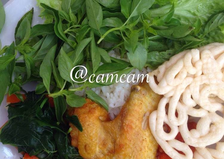 Makan dengan nasi putih panas, kerupuk dan lalapan apa saja