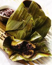 Bungkus adonan tersebut (1 sdm setiap bungkus), satukan tiap 3 bungkus, ikat dan kukus sampai matang.