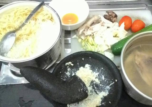Rebus ayam kampung dengan air sampai agak empuk, api sedang saja. Suwir ayam, sisihkan kaldu untuk kuah.
