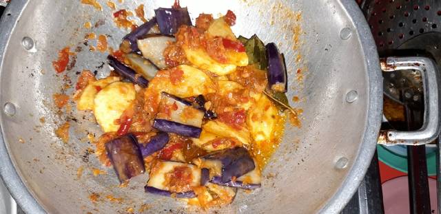 Masukkan terong dan kentang aduk rata sebentar smp bumbu meresap, icip tes rasa