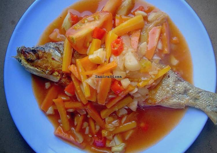 Tata bandeng di atas piring saji. Siram bandeng dengan kuah asam manisnya.