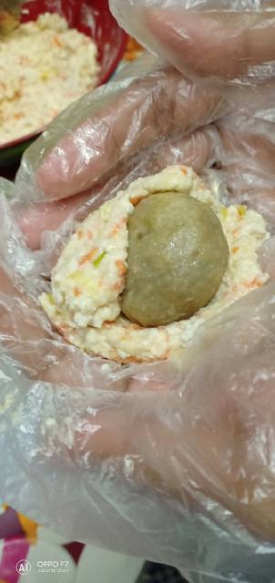 Pipihkan adonan kemudian isi dengan bakso sapi, bentuk adonan menjadi bulat untuk uk besar dan kecilnya sesuai selera.