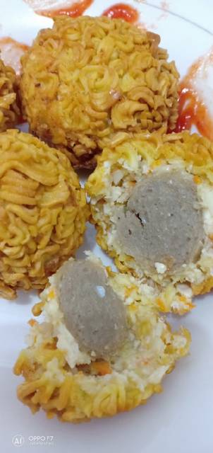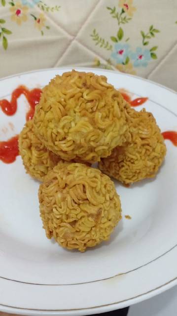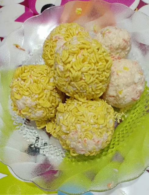 Gulingkan bola-bola tahu diatas mie yg sudah diremukkan (aq buat 2 opsi, yg satu pakai balutan mie, yg satu polosanðŸ˜Â). Goreng bola-boka tahu dengan api yang kecil..kalau terlalu panas bola-bola tahu bisa tidak masak didalamnya..