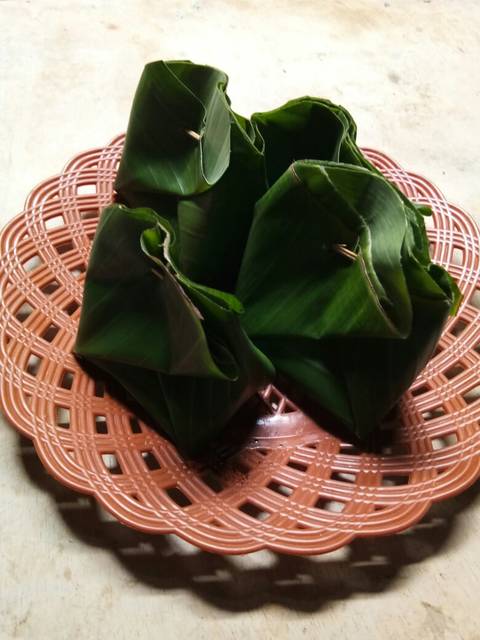 Ambil daun pisang, letakkan potongan daun salam lalu tuang secukupnya adonan bothok, bungkus bentuk tum, sematkan tusuk gigi