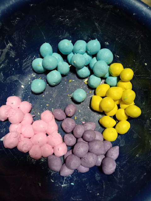 Beri masing2 warna sesuka hati. (Me 3 tetes masing2 warna) aduk lalu bentuk bulatan.