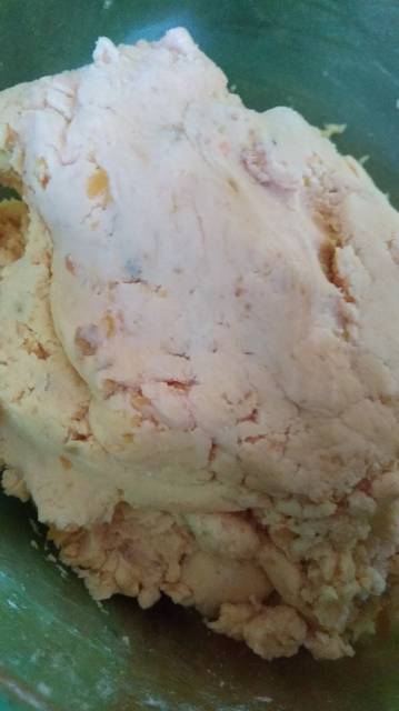 Kemudian ubinya dihalusin dan dicampur dengan tepung ketan putih, tepung kanji sedikit, dan garam. Supaya rasanya tetap gurih.