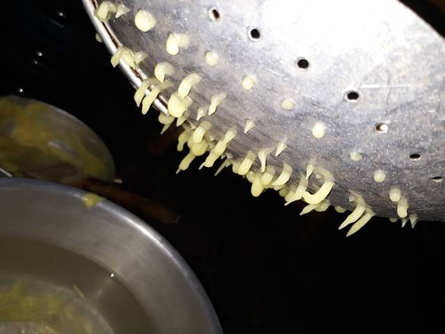Larutkan tepung beras dan tepung tapioka dg air kapur sirih, berikan pewarna dan santan cair