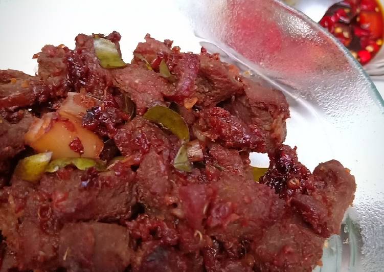 Tambahkan air lagi (1 gelas mug), masukkan bumbu, sereh, daun jeruk dan kecap, aduk dan biarkan hingga air habis (kering sampai gosong)
