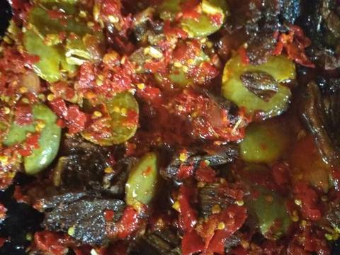 Masukkan gorengan daging dan jengkol aduk rata di cabe yg sdh di tumis