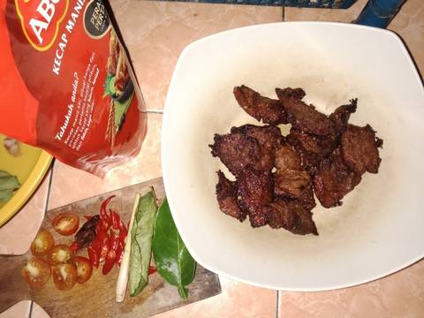 Setelah halus tumis bumbu hingga matang masukan daging yg sudah digoreng lalu masukan bumbu yg sudah di iris tadi serta tambahkan kecap manis sesuai selera.