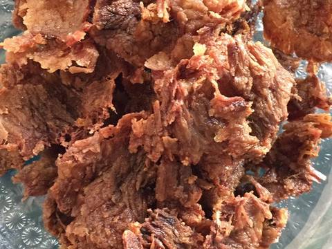 Jika sudah iris tipis2 daging lalu geprek2 pakai ulekan hingga tipis, lalu goreng sampai garing