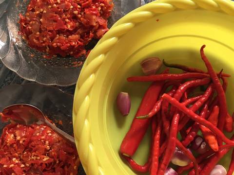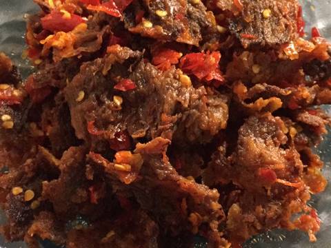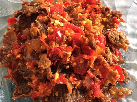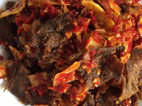 Buat sambel, ulek kasar cabe+bawang, lalu tumis pakai minyak yg bekas goreng daging secukupnya, tambahkan garam+gula+perasan jeruk nipis,, lalu masukan daging+kentang yg sudah digoreng garing