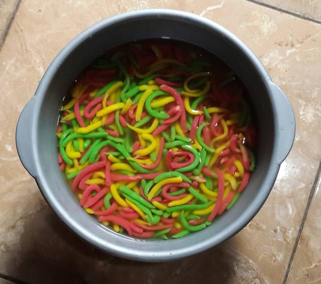 Note; setelah kental matang dalam membagi adonan mjd tiga warna dan proses pencetakan cendol kudu cepat, agar adonan tidak keburu mengeras mjd jel.