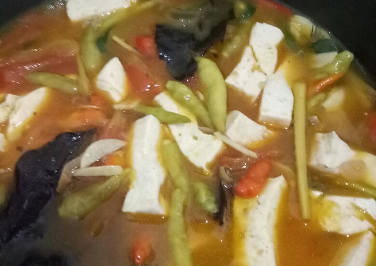 Masukkan potongan tomat bila rasa sdh pas. Masukkan tahu yg sdh direbus. Biarkan mendidih sebentar. Angkat. Sajikan.