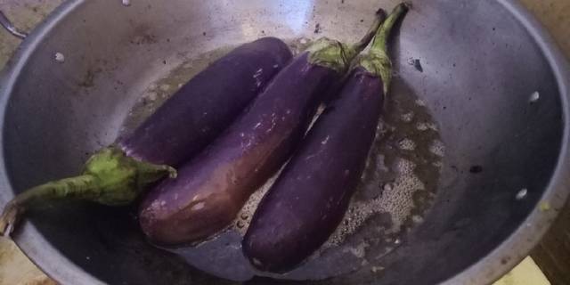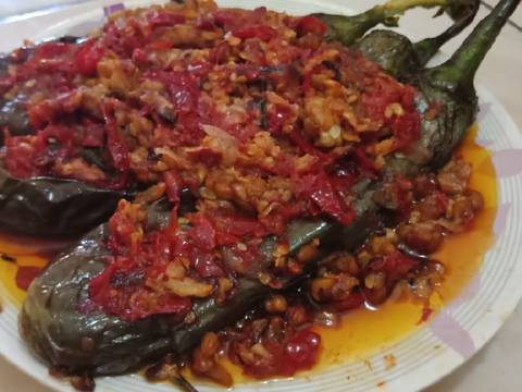 Geprek halus terong, baluri dengan sambal, sisipi sayatan terong dengan sambal.