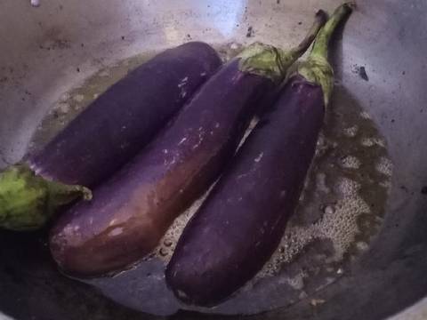 Cuci semua bahan, sayat lurus terong untuk disisipi sambal kemudian goreng hingga kecoklatan.