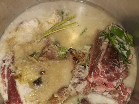 Peras kelapa dengan segelas air lalu campur ke daging beserta kelapany juga masukkan bumbu halus daun salam sereh lengkuas geprek garam gula dan kaldu bubuk dalam panci presto test rasa