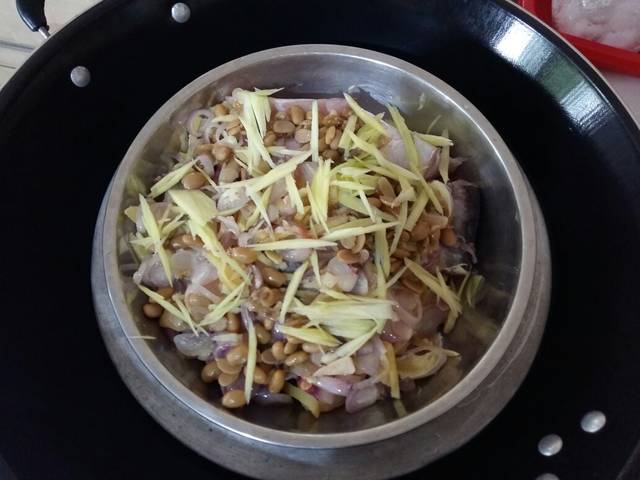 Begitu pula dengan Tauco dan mangga mudanya ditaburi di atas ikan. Untuk mangganya sedikit saja, dipakai untuk mendapatkan rasa segar pada ikan saja. Jumlah irisan mangga seperti pada gambar. Tambahkan sedikit kaldu jamur.