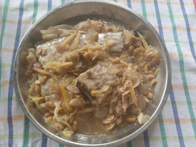 Bawang merah dan bawang putih diiris tipis, jahe iris korek, kemudian dioseng dengan sedikit minyak hingga harum dan taburi di atas ikan yang sudah ditata di atas piring.