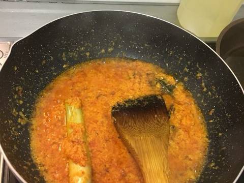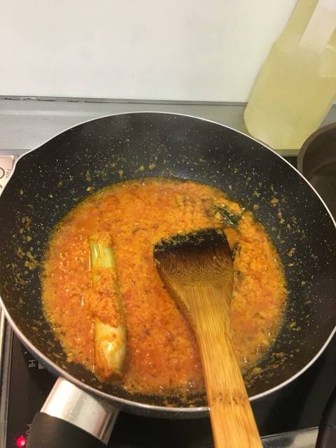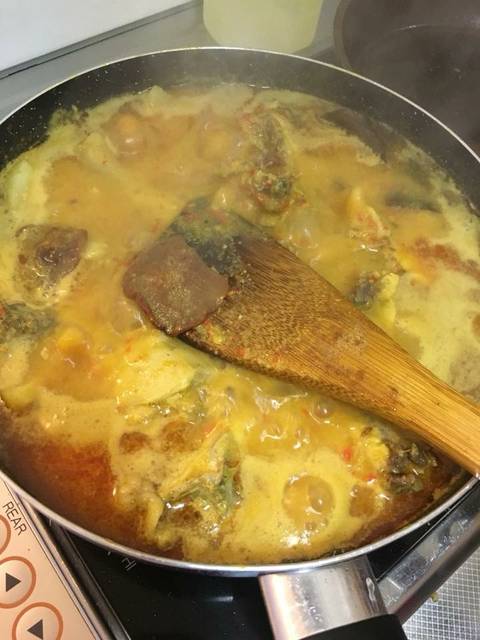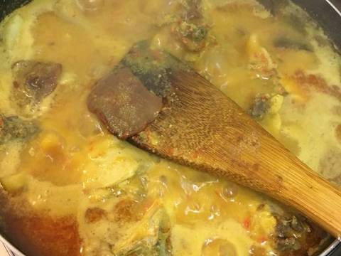 Panaskan wajan yang cukup besar, panaskan minyak goreng. Masukkan daun jeruk, serai, asam kandis dan daun kunyit terlebih dahulu, setelah keluar aromanya baru masukkan bumbu halus. Masak bumbu halus hingga aroma keluar dan bumbu tanak, masukkan santan kental. Aduk terus hingga mendidih,