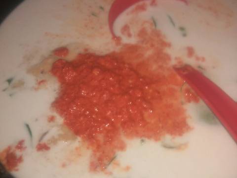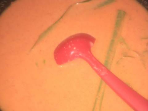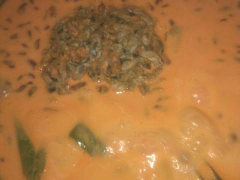 Campurkan santan,bumbu halus dan daun²an,masak hingga mendidih sambil terus di aduk