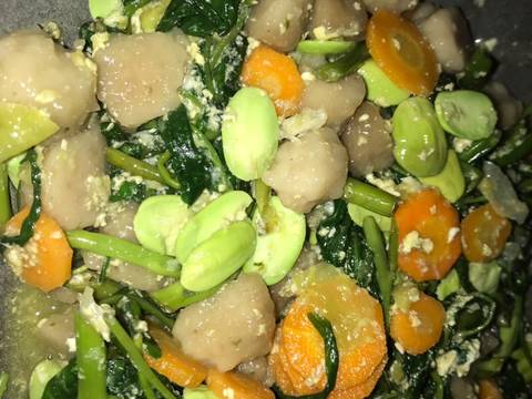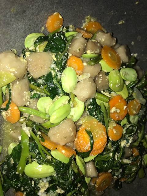 Setelah wortel sudah masuk dan mulai layu masukkan kangkung di aduk sampai layu lalu masukkan lagi pete dan di beri sedikit air