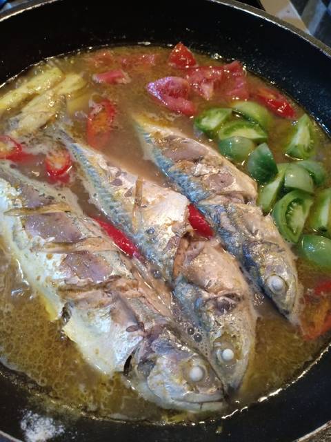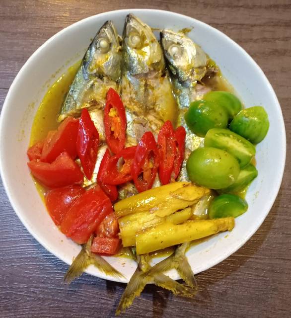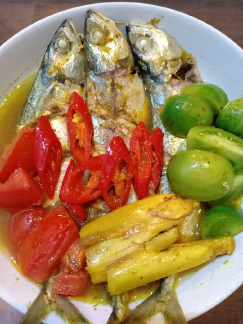 Tumis bumbu halus yang sudah diblender, setelah matang bumbunya, masukan ikannya, sereh, daun kunyit dan tambahkan 300 ml air. Masak sampai mendidih