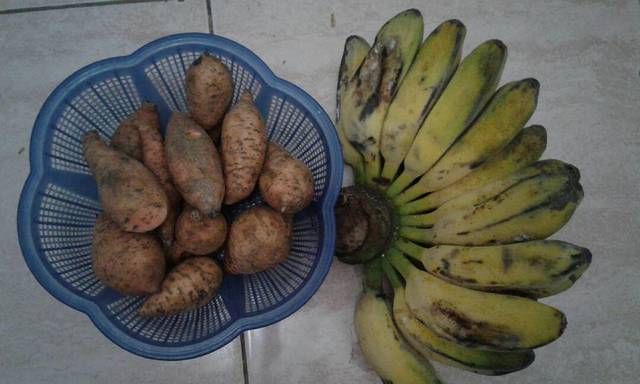 Rebus pisang dengan ubi cilembu dan tambahkan gula aren lalu masukkan pandan iket simpul