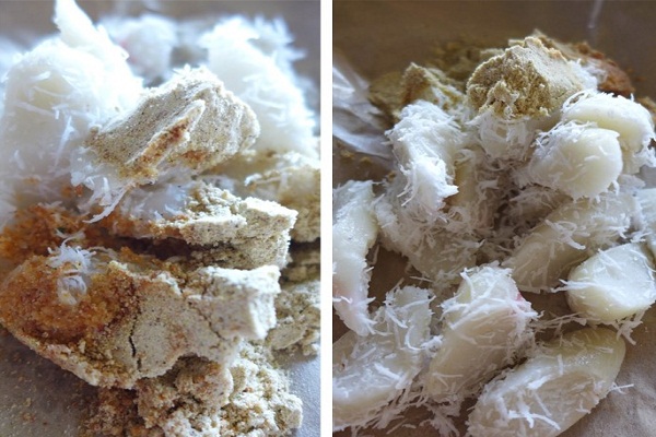 5. Setelah matang dinginkan dan diiris tipis, sajikan dengan parutan kelapa dan gula merah (yang dipanaskan dengan air sampai mencair).
