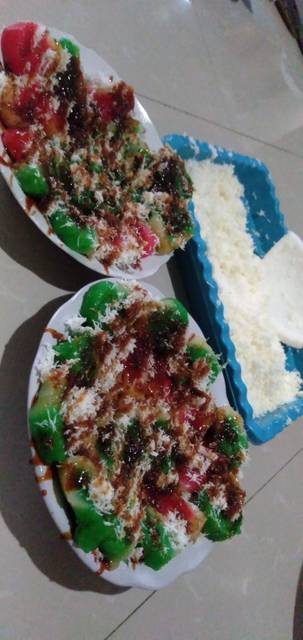 Bagi dua adonan singkong yang sudah digiling halus kemudian warnai merah dan hijau.