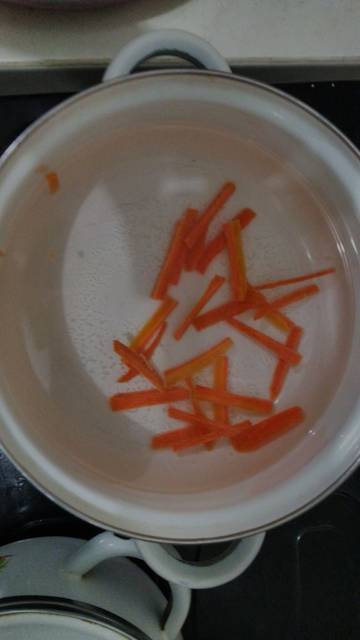 Masukkan dalam air mendidih: wortel, tunggu sebentar masukkan mie telor. Sekitar 2 menit kemudian masukkan kol. Setelah mie dirasa cukup matang dan kenyal, angkat tiriskan