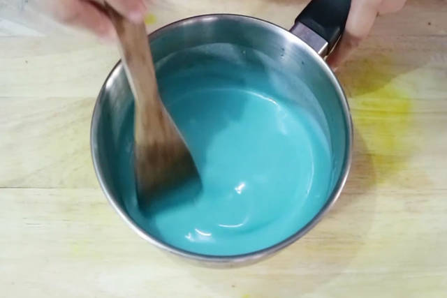Masukan tepung beras, gula, air dan pewarna makanan. Aduk merata