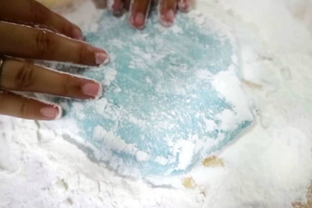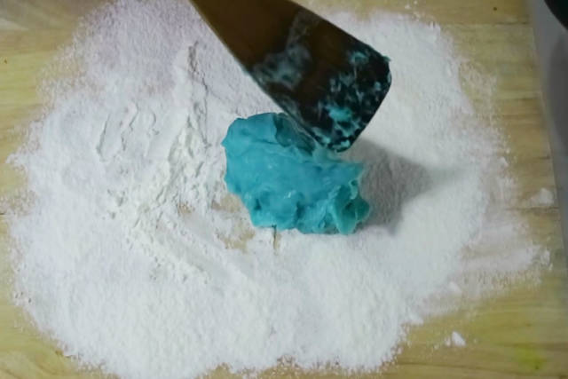 Taburi tepung maizena diatas talenan, pindahkan adonan ke atas talenan.