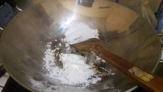 Sangrai tepung maizena sampai ringan. Hati-hati gosong.