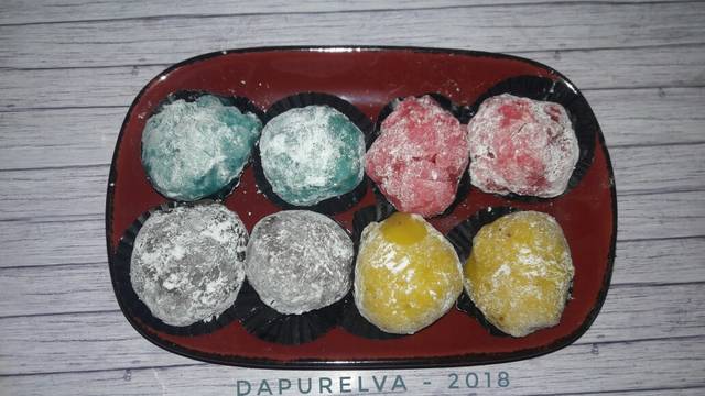 Taburkan tepung maizena ke tangan, buat bulatan dan isi dengan selai. Ini bagian tersulit buat saya karena super lengket. Untuk isian saya bedakan berdasarkan warnanya. Untuk merah diisi selai strawberry, kuning diisi selai kacang, biru diisi selai blueberry, dan coklat diisi selai coklat. Lumuri dengan tepung maizena sangrai.