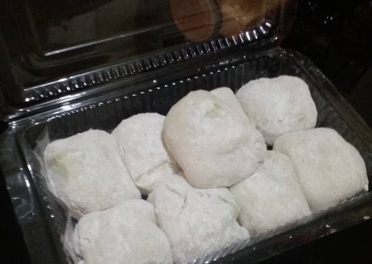 Keenam : bentuk adonan sesuai selera taburkan lebih dahulu maizena sedikit talenan agar tidak lengket tambah isian melon/mangga kalau aku bentuk nya kaya kotak gitu ya..selesai kalo misalnya ga langsung dimakan taruh kulkas dulu menurutku masukin kulkas dlu agar lebih enak