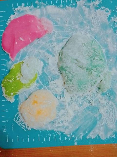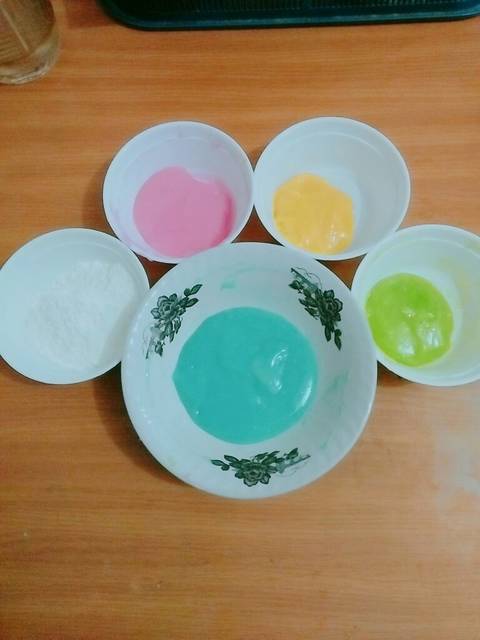 Lalu bagi menjadi beberapa bagian, warnai dengan ditetesi pewarna makanan & aduk rata