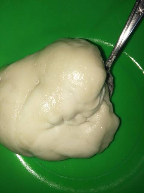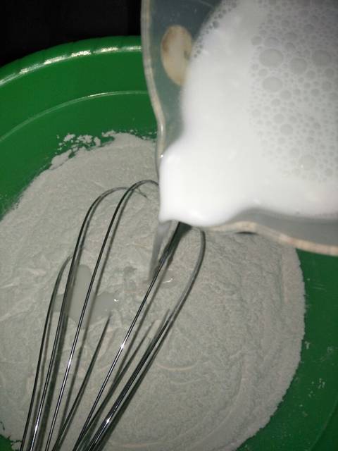 Di wadah terpisah, campurkan santan dengan air hangat, aduk rata.