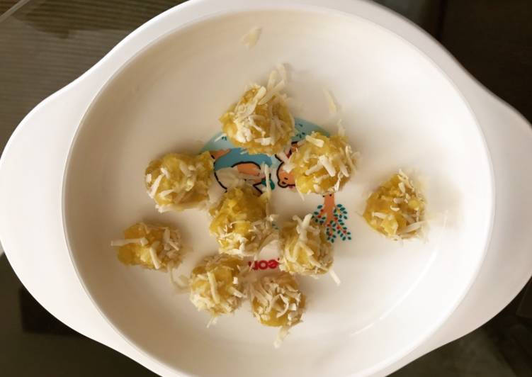 Kerok ubi cilembu dgn sendok kemudian dibuat bulat2, di beri taburan keju