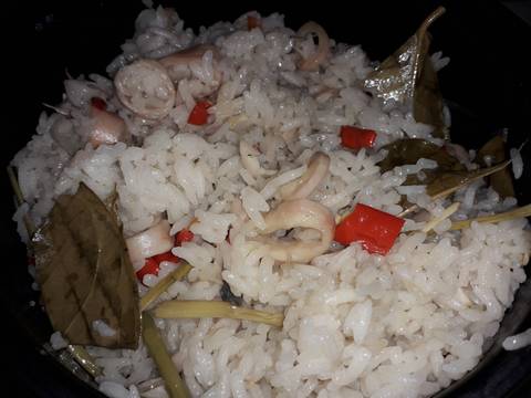 Beras yg sudah di cuci masukkan dalam magic com bersama bumbu2 dan tumisan bawang dan cumi, masukkan air secukup nya...aduk2 sampai rata.